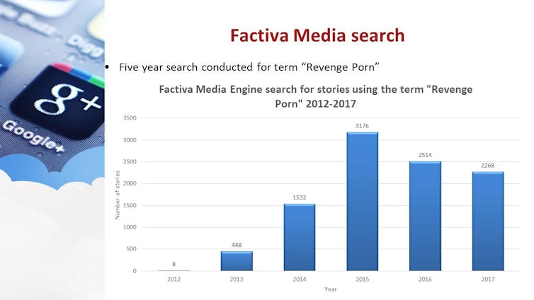 A search of the Factiva media search engine using the term “revenge porn” shows that in 2012 there were eight stories in the international media. Just three years later, there were 3,176.