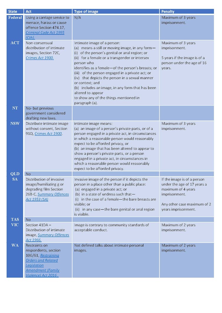 This move to specific laws reflects overseas trends. In the US, 38 states (plus Washington DC) have criminal laws against revenge porn, with legislation pending in additional states. The UK, Canada, New Zealand and Japan are just some of the countries to adopt specific revenge porn laws. Many of these laws extend revenge porn from distribution of an intimate image to include the creation of, and threats to distribute, those images.